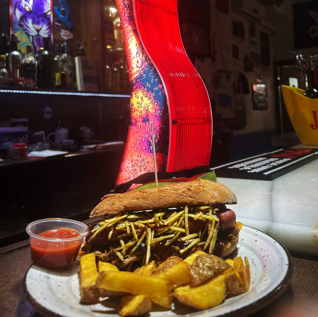 Pan sin gluten, salchicha fresca, cebolla encurtida, queso cheddar, Pulled pork, salsa bbq y patatas paja.